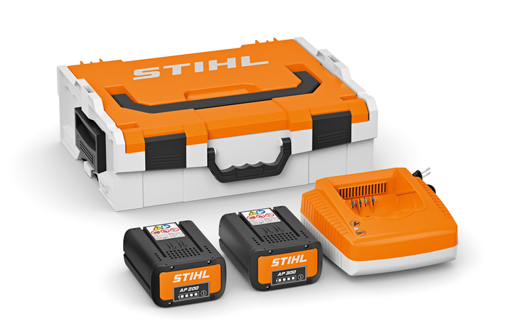 Box Power a batteria Stihl completamente accessoriata con due batterie e un caricatore, per operazioni prolungate con prodotti a batteria.