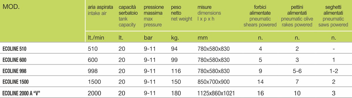 Un compressore economico e affidabile di alta qualità a prezzo contenuto. Per alimentare seghetti, forbici e abbacchiatori pneumatici.
